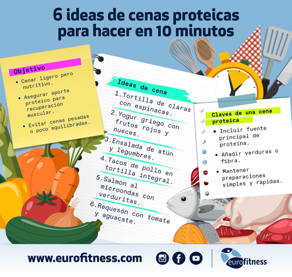 Además, en esta infografía encontrarás las claves para construir una cena proteica equilibrada: incluir una fuente principal de proteína, añadir verduras o fibra y apostar por preparaciones simples que faciliten la constancia.