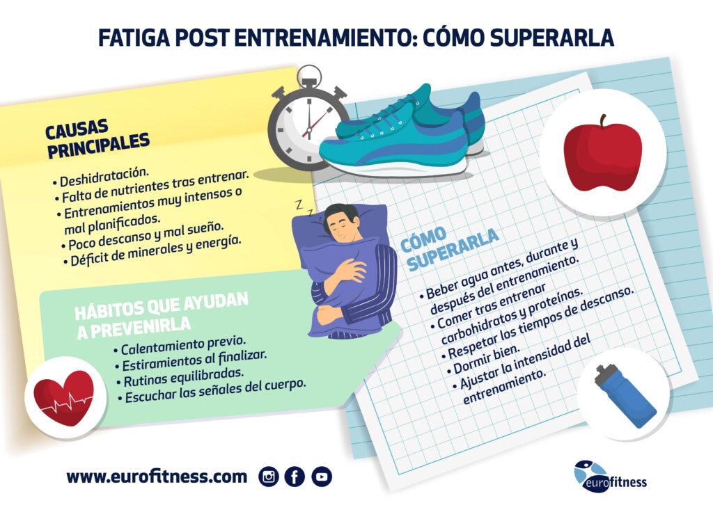 En Eurofitness sabemos que entrenar bien también implica recuperarse mejor. Por eso hemos creado esta infografía visual con las causas más frecuentes de la fatiga, consejos prácticos para prevenirla y las claves para superarla con éxito. Hidratarse, alimentarse adecuadamente, descansar bien y ajustar la intensidad del entrenamiento son solo algunos de los hábitos que marcan la diferencia.